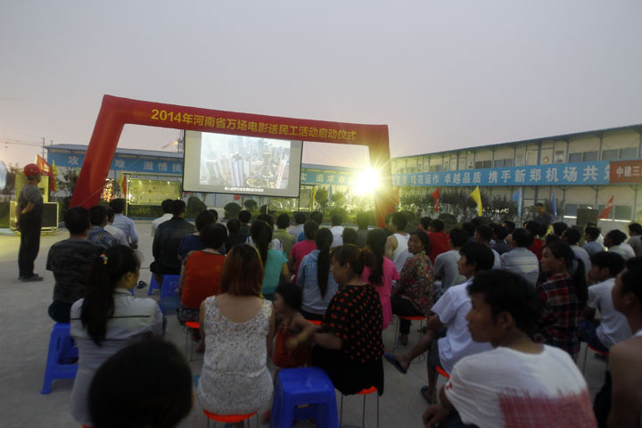 6月10日晚8時(shí), 鄭州機(jī)場(chǎng)二期工程建設(shè)工地中建三局新鄭機(jī)場(chǎng)T2航站樓項(xiàng)目指揮部大院內(nèi)人聲鼎沸、歡歌陣陣,由中共河南省委宣傳部、河南省廣電局、鄭州機(jī)場(chǎng)二期工程建設(shè)指揮部主辦,鄭州市文化廣電新聞出版局、河南新農(nóng)村數(shù)字電影院線有限公司、鄭州商都數(shù)字電影院線有限公司、中建三局新鄭機(jī)場(chǎng)T2航站樓項(xiàng)目部承辦的2014年河南省萬場(chǎng)電影送民工活動(dòng)啟動(dòng)儀式如期舉行,300余名鄭州機(jī)場(chǎng)二期工程參建人員興致勃勃地觀看了河南影視制作集團(tuán)出品的《永遠(yuǎn)的焦裕祿》和《新少林寺》等影片。河南省委宣傳部常務(wù)副部長王耀;河南省新聞出版廣電局黨組副書記、副局長宋鳳仙;鄭州機(jī)場(chǎng)二期工程建設(shè)指揮部副指揮長、河南城際鐵路公司常務(wù)副總經(jīng)理劉光明等領(lǐng)導(dǎo)同志出席了啟動(dòng)儀式。